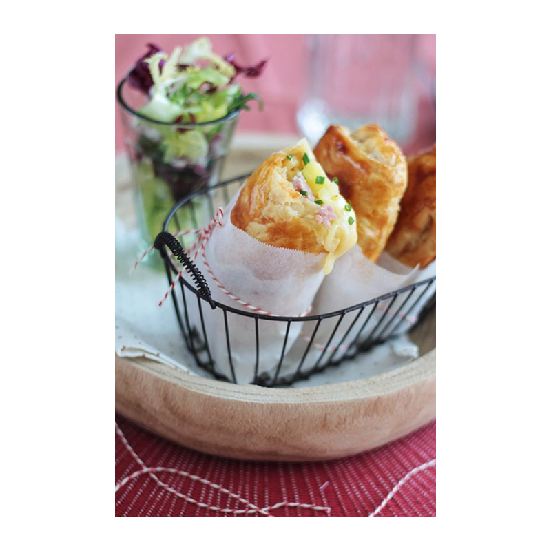 - Posez sur chaque cercle de pâte feuilletée de la pomme de terre, de la poitrine de porc, de la raclette et des lamelles de cornichon.
